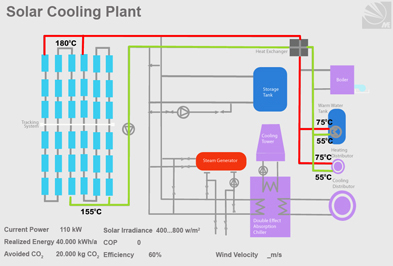 This rising demand for cooling and air-conditioning in buildings involves unfavourable fossil fuel consumptions as well as upcoming stabiliIty problems in the electrictity supply in mediterraenean countries, which in turn demands for costly upgradings of the grids to handle electricity peak power demand situations. Thus, improved building concepts, targeting on reduction of cooling loads by passive and innovative measures, and the use of alternatives in coverage the remaining cooling demands of buildings, are of interest. Solar driven or assisted cooling is one of the possibilities to provide acively cold. Solar cooling or solar air-conditioning is used for solar thermally driven processes. Solar cooling in this sense may contribute to: